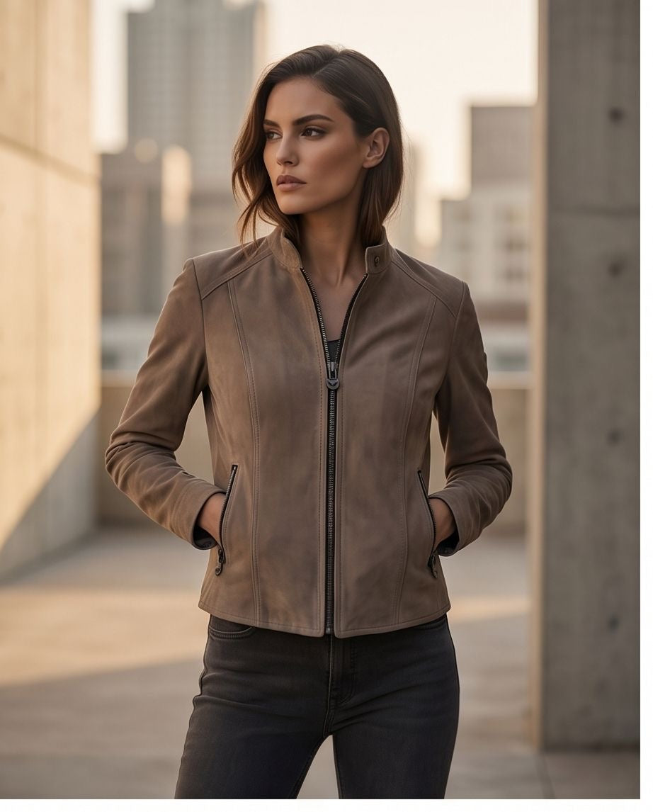 The jacket features a sleek, tailored silhouette that flatters the figure, complemented by a minimalist stand collar and a smooth front zipper closure for a clean, contemporary look. Subtle seam detailing enhances its refined structure, while the zippered side pockets add both functionality and a touch of urban sophistication.